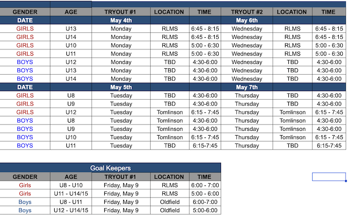 - Full-time goalkeepers should attend the GK Tryout Session plus Tryout #2 of the corresponding age group.